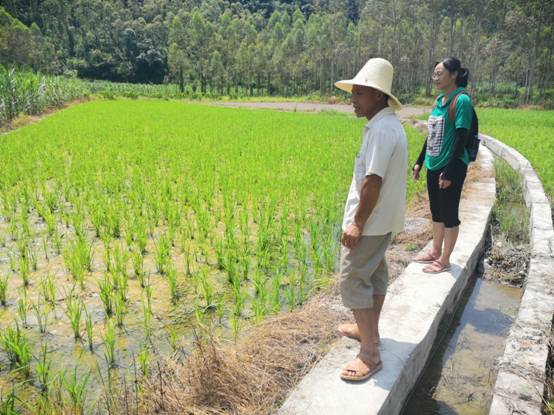 现场查看帮扶对象参加柳南区奖补项目(水稻)的种植情况(马川容摄)