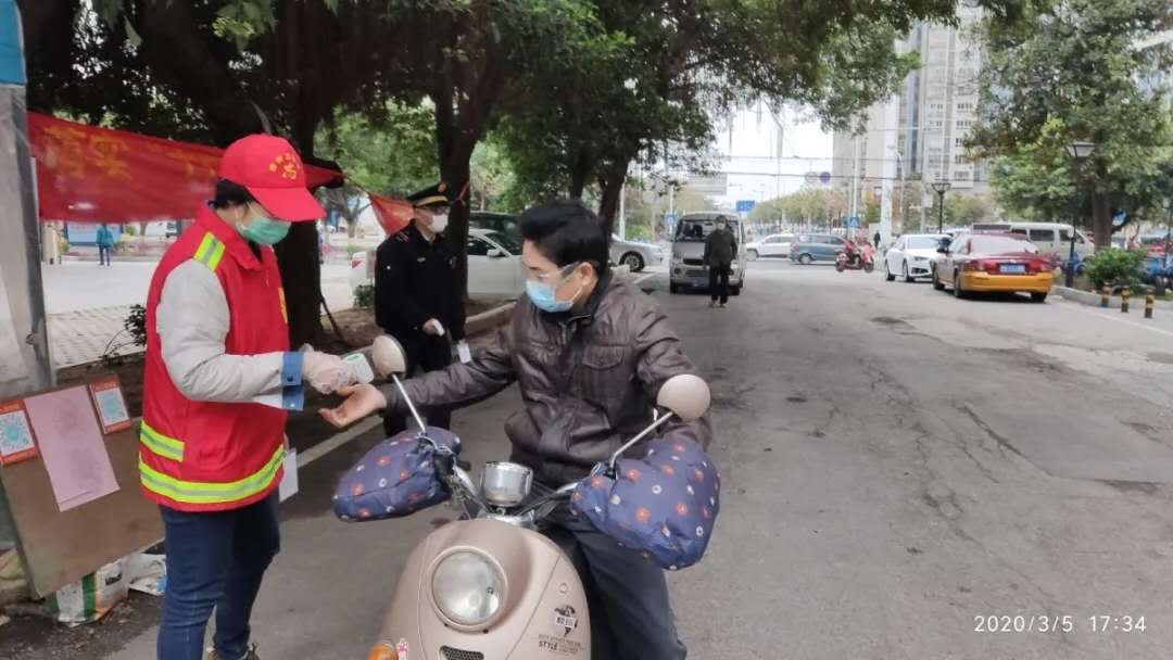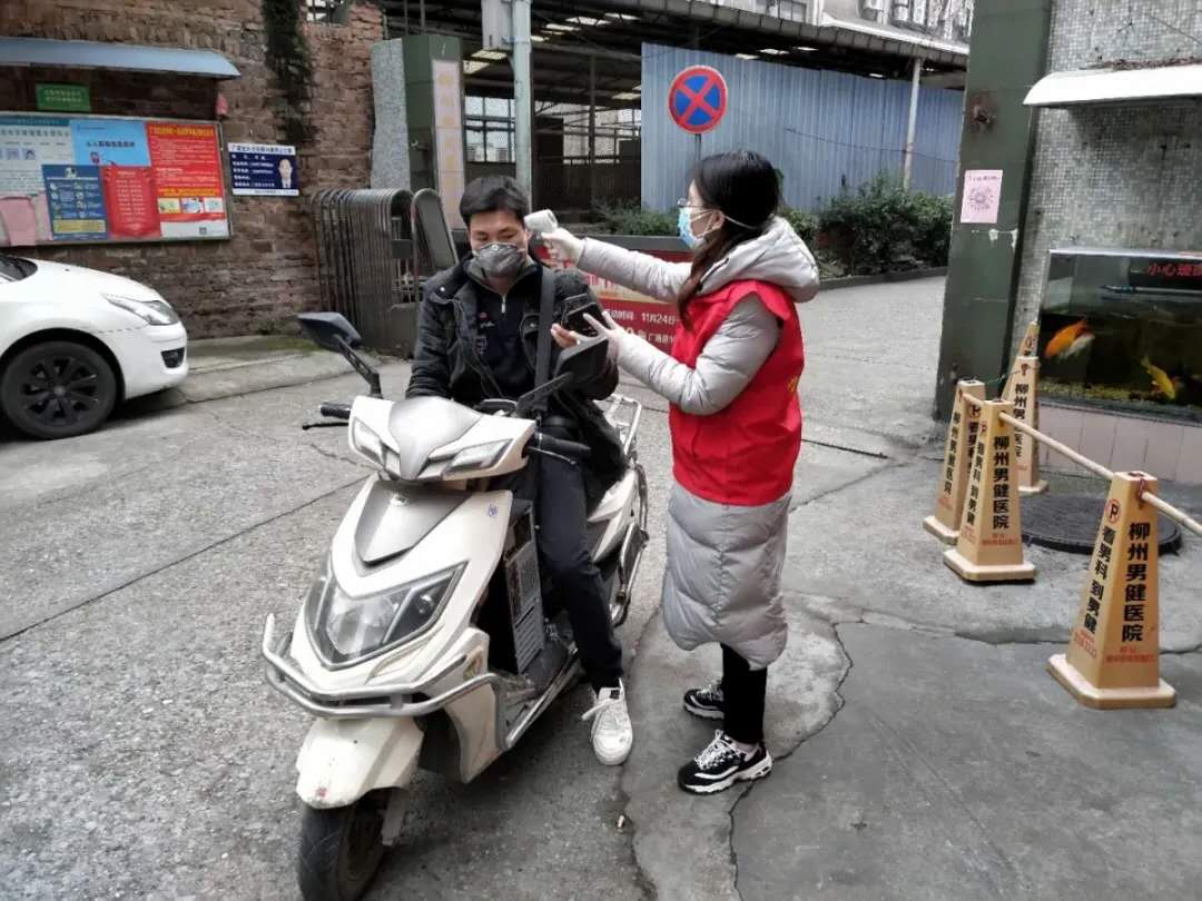 “您好,进入社区请扫码登记、量体温?!薄ⅰ澳?,请您停车测量一下体温。” 在柳南区南站街道疫情监测点,市财政局的志愿者们正在对小区居民监测体温,对来访的每一名群众排查登记,确保疫情工作顺利开展。