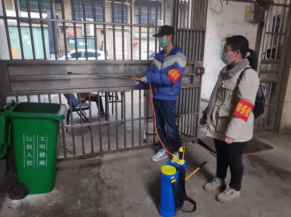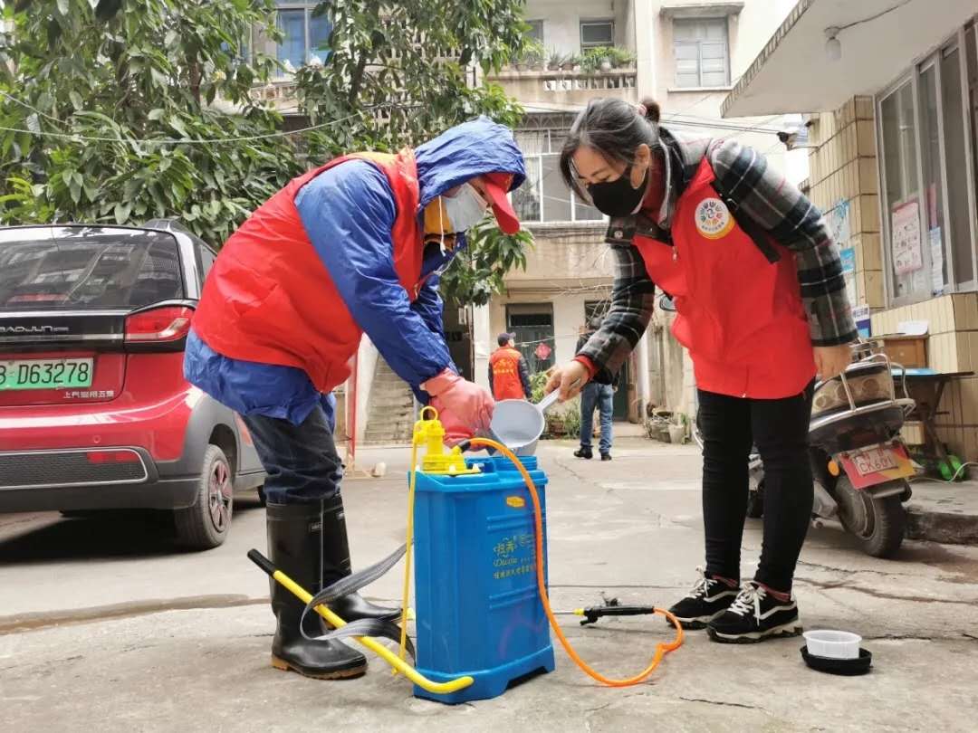 市社科联志愿者们在鱼峰区红锋社区对小区环境进行清洁消杀工作,手拿小喇叭为居民宣传防疫知识。