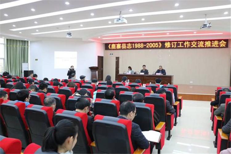 图为柳州市方志办主任罗方贵(中)参加《鹿寨县志1988-2005》修订工作交流推进会