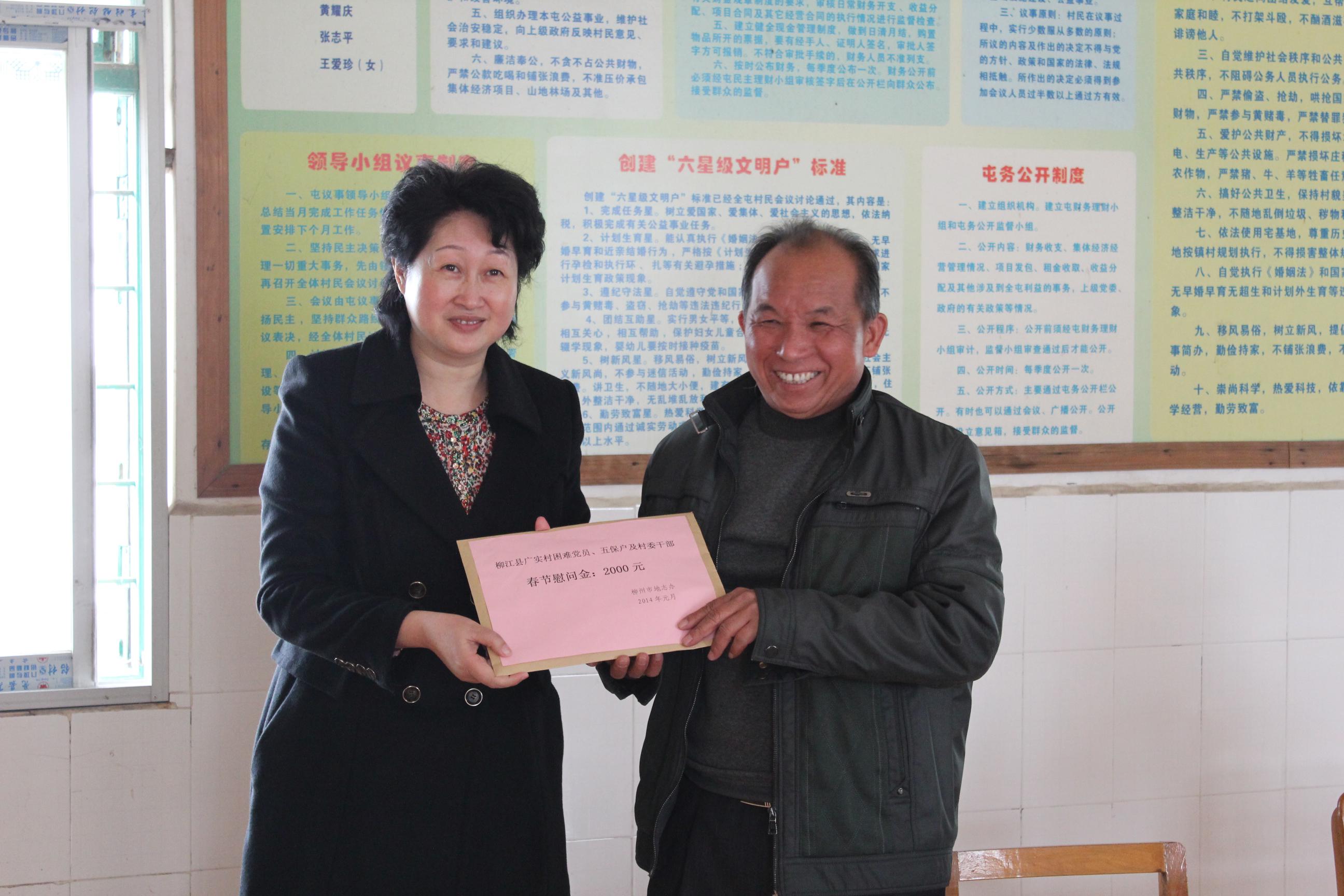 2014年1月24日,柳州市地方志办公室主任吴玛霞(右二)将慰问金赠送给广实村困难党员、五?;А?/span>