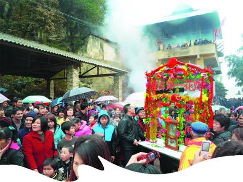 庙会期间,各路善男信女抬着花炮,一路舞狮、焚香燃炮,吹吹打打来到盘古庙,先进行对歌,跳民族舞和抢花炮,最后才是最重要的祭祖。祭祖先燃放鞭炮,告诉盘古,他的后代子孙没有忘记他的功德,今年又来祭拜他了。