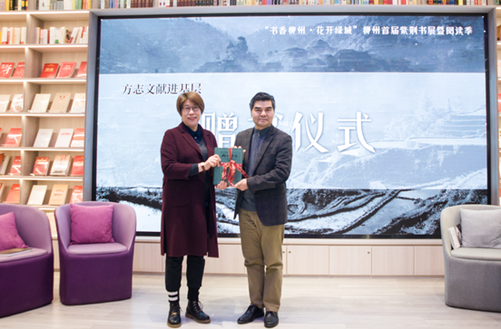 罗方贵主任(右)代表市地方志办向紫荆花书院赠送《柳州市志》等书籍一批