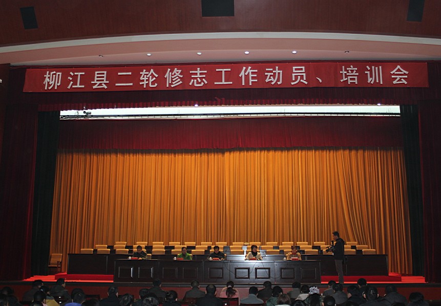 2012年12月25日,中共柳江县委、县人民政府在县政府中心礼堂召开柳江县第二轮修志动员暨培训会,贯彻落实12月4日自治区人民政府召开全区地方志工作电视电话会议精神,部署2013—2015年全县二轮修志工作任务。参加会议的有县领导和区、市业务部门领导及各乡镇、各部委办局、人民团体、企事业单位的主要领导和修志业务人员共200余人。县委书记覃建波,市地方志办公室主任吴玛霞,自治区市县志工作处梁燕鸣副处长在主席台就座?;嵋橛上匚N?、宣传部部长、副县长覃海雪主持。