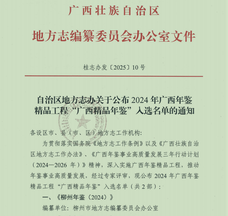 3月17日,广西地方志办公室发文公布2024年广西年鉴精品工程“广西年鉴精品”入选名单(桂志办发〔2025〕10号)?!肮阄髂昙贰笔亲灾吻胤街景旃抑氐愦蛟斓牡胤街疚幕こ?,《柳州年鉴(2024)》为此次唯一一部入选的市级综合年鉴,广西地方志办向柳州市人民政府发来贺信。市政府分管领导对此作出肯定性批示。
