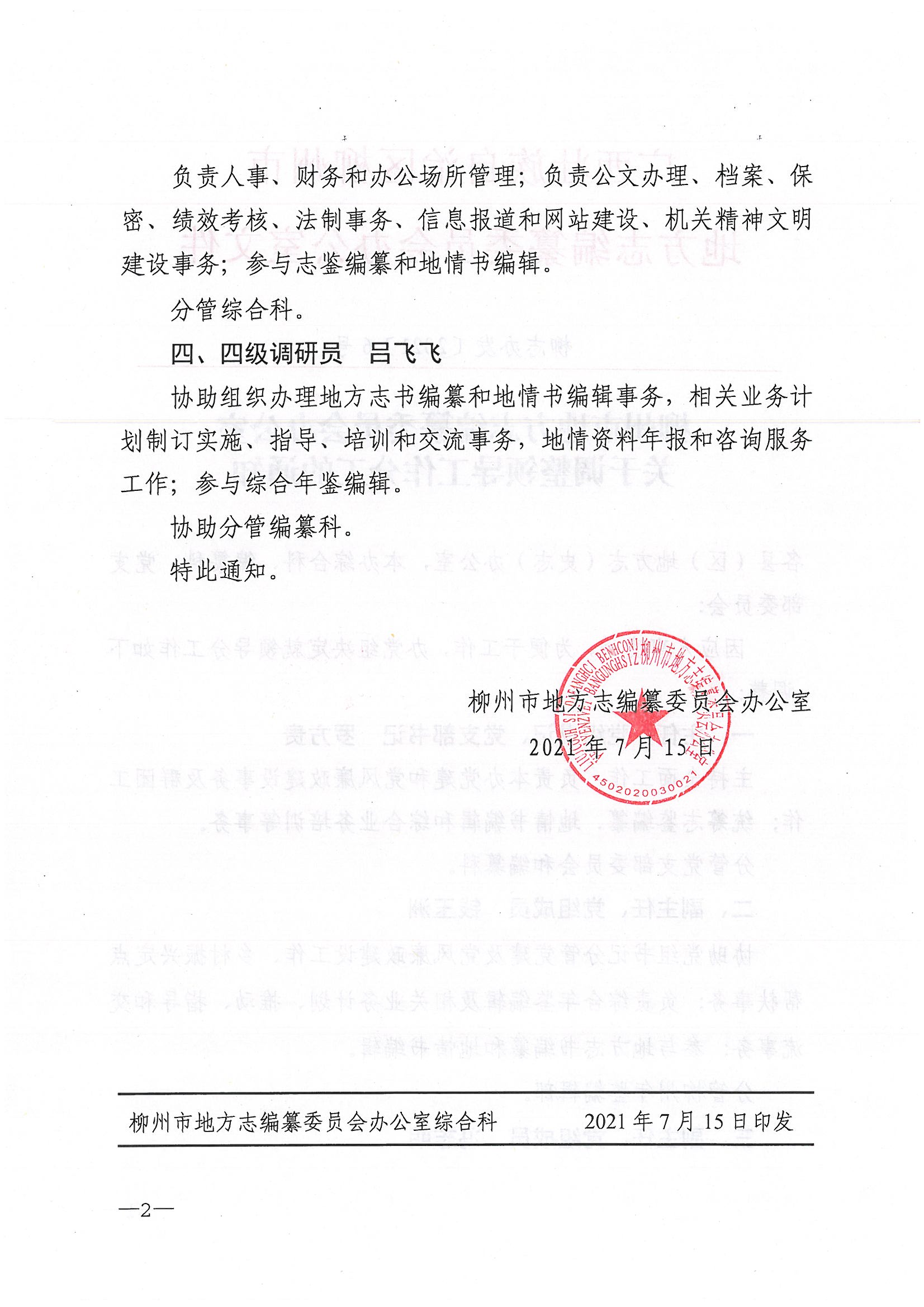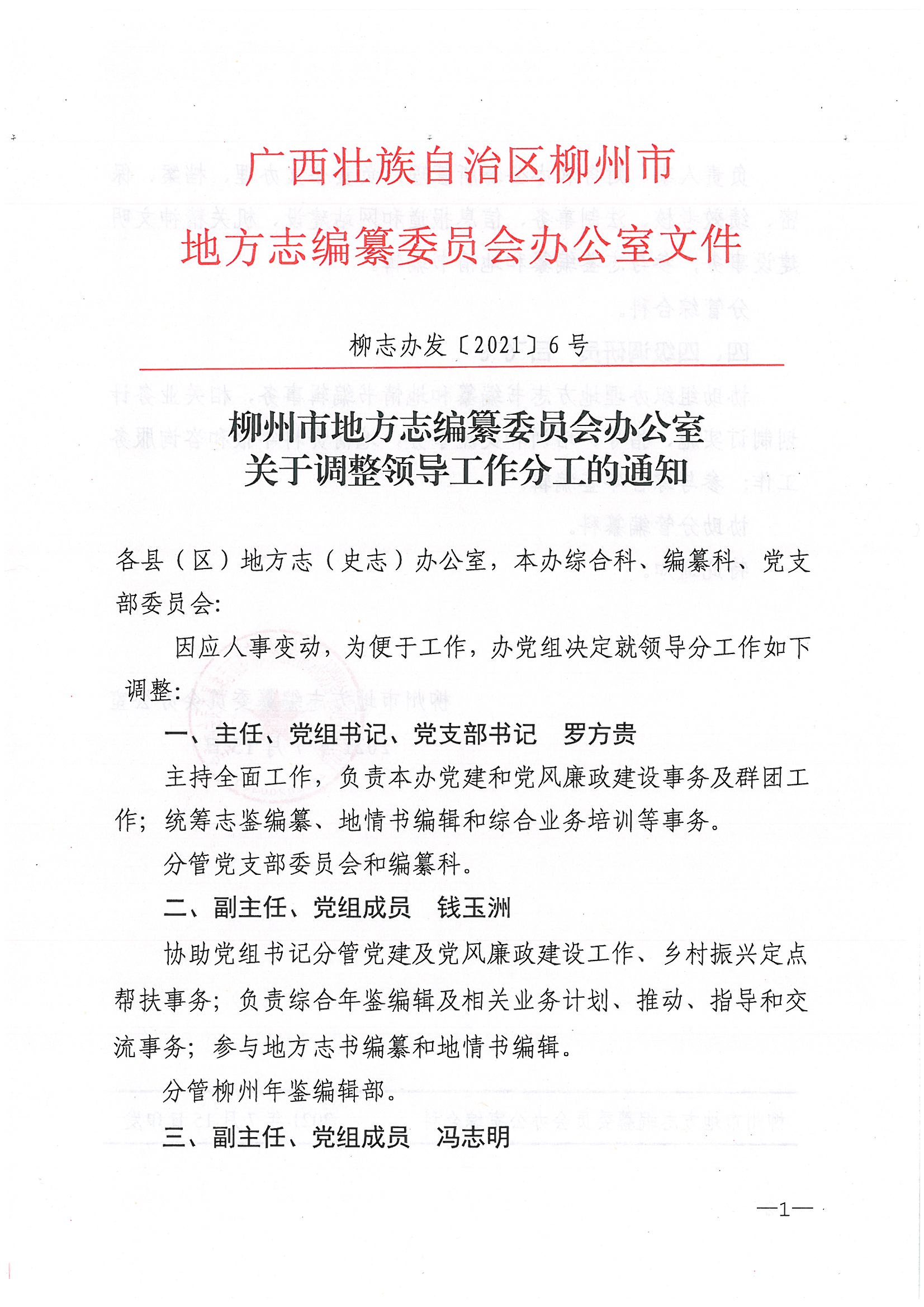 柳志办发〔2021〕6号 柳州市地方志编纂委员会办公室 关于调整领导工作分工的通知